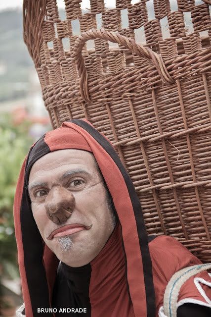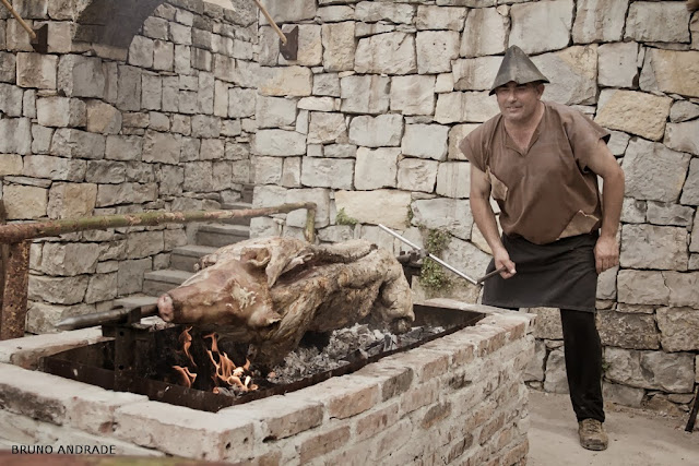 espeto por cima de brasas. Nas tendas os artesãos impingem os seus produtos de