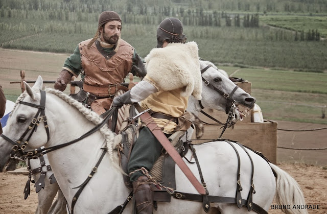 investida que à segunda termina com um dos cavaleiros embrulhado no pó do chão